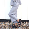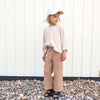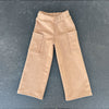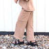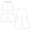 A slightly cropped wide leg pant with generous side pockets and an elastic waistband. The top portion is slim fitting.